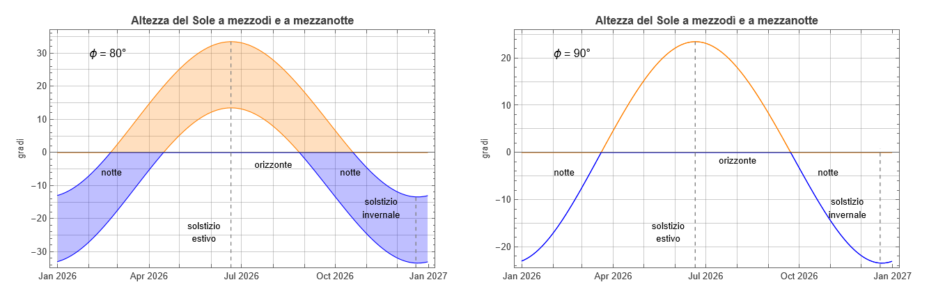 Nelle figure seguenti riportiamo, variando la latitudine, gli andamenti annuali dell'altezza massima raggiunta dal Sole a mezzogiorno assieme alla sua altezza minima raggiunta alla mezzanotte.