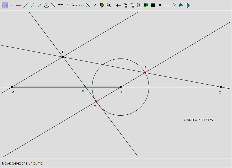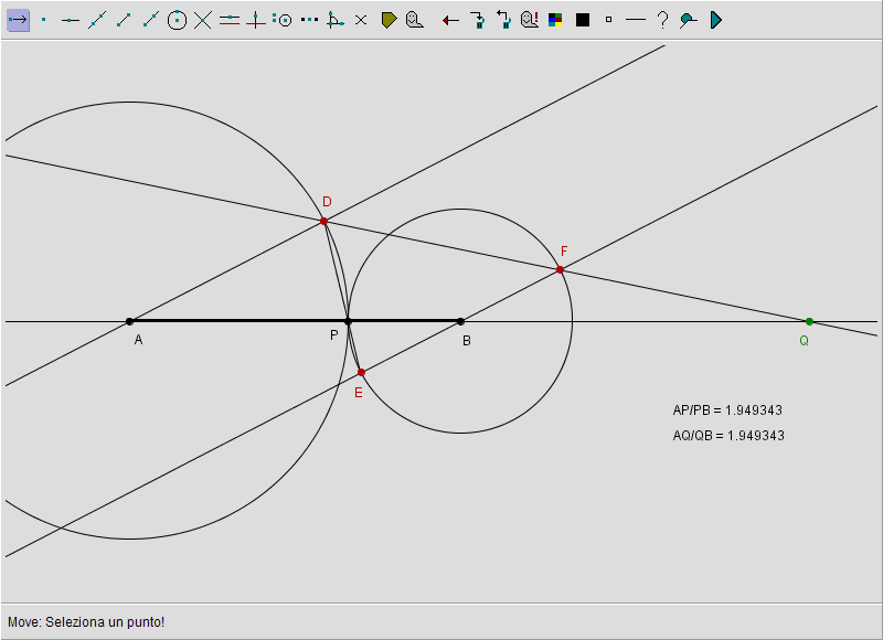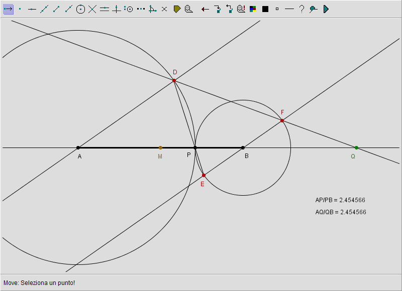 Rimane da discutere il caso in cui P coincida con M quando il rapporto a primo membro della proporzione assumerebbe valore unitario. In tal caso però il secondo membro non può essere definito: difatti essendo Q esterno al segmento AB, AQ non potrà mai essere congruente a QB: si potrà avere solo AQ > QB oppure, in alternativa, AQ < QB. Di conseguenza dobbiamo escludere che P possa coincidere con M. In effetti la costruzione in tal caso ci mostra (trascinare P in modo da sovrapporlo a M) che le due circonferenze assumono il medesimo raggio cosicché la retta DF risulta parallela ad AB e pertanto, non esiste l'intersezione di DF con AB. Possiamo solo dire che se P si avvicina a M da destra o da sinistra, Q si allontana (da una parte o dall'altra) dagli estremi del segmento AB: convenzionalmente diremo che il punto Q va all'infinito o che il coniugato armonico di M è un punto all'infinito.