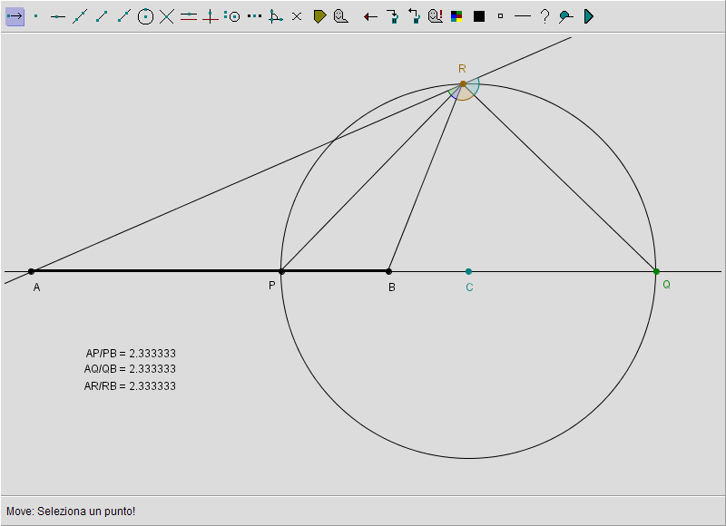 come volevasi dimostrare. Nelle figure 6 e 7 si può trascinare il punto R e verificare in tal modo che il rapporto AR / RB rimane costante ed è quindi indipendente dalla posizione di R sulla circonferenza. Ciò conferma come questa circonferenza sia appunto il luogo dei punti cercato. La medesima espressione algebrica mostra invece come questo rapporto dipenda solo dalla posizione di P rispetto agli estremi A e B.