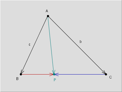 Per utilizzare la conclusione (1) del precedente problema, dobbiamo individuare il rapporto k nel quale la bisettrice dell'angolo in A divide il lato opposto BC. Questo rapporto si ottiene facilmente se ricordiamo quanto afferma il teorema delle bisettrici: con le notazioni di fig. 15 e supposta AP la bisettrice di