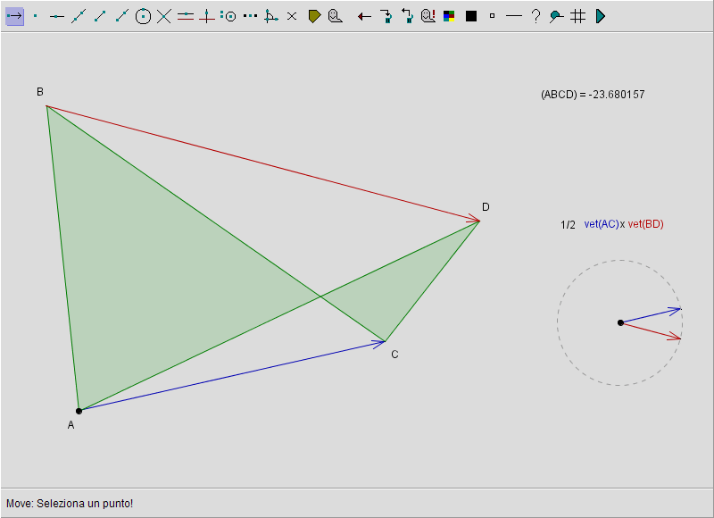 Nella medesima figura appaiono pure i due vettori AC e BD e, per facilitare il riconoscimento del verso (entrante o uscente dal monitor/foglio) di 1/2 AC x BD si sono costruiti, con i medesimi colori, due altri vettori di ugual modulo, uscenti dallo stesso punto e paralleli rispettivamente a AC e BD. In tal modo se il verso che porta il primo, AC, sul secondo BD, attraverso l'angolo minore è orario, 1/2 AC x BD possiede verso entrante e l'area del quadrilatero (ABCD) è negativa, viceversa se il verso risulta antiorario.