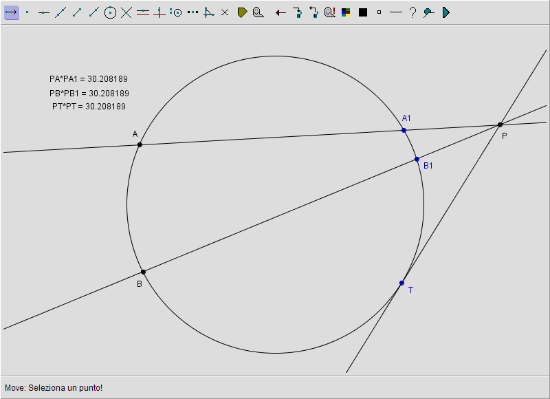 Ora, tenendo fisso P, si muovano i punti A o B verificando che i prodotti PA x PA1 e PB x PB1 non variano: variano invece quando si trascina P. Finché P è esterno alla circonferenza questi sono uguali pure a PT2, termine che evidentemente è costante (finché non si muova P). Quando P è interno, l'uguaglianza PA x PA1 = PB x PB1 si mantiene ancora valida.