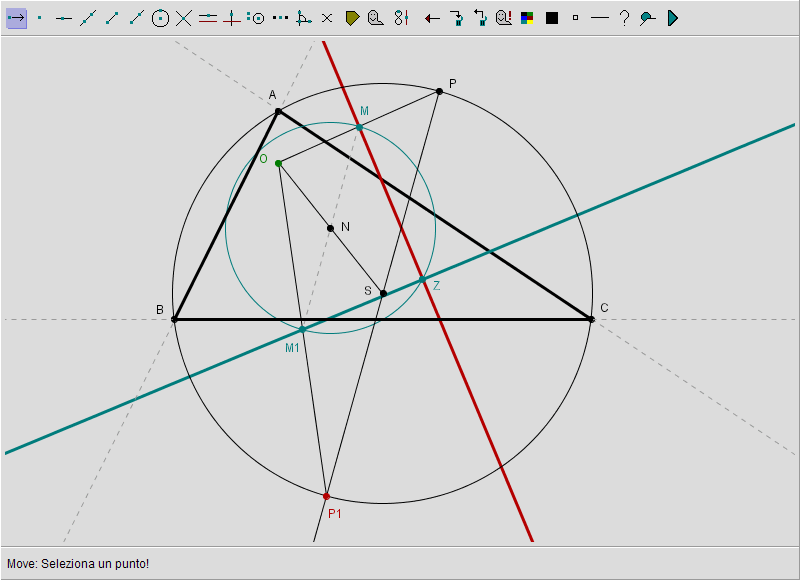 Prima di indagare sui legami esistenti tra la linea di Simson di un punto e l'ortocentro del triangolo conduciamo una piccola sperimentazione. Costruito quindi l'ortocentro O colleghiamolo al punto P con un segmento e quindi determiniamo l'intersezione M tra OP e la linea di Simson di P.