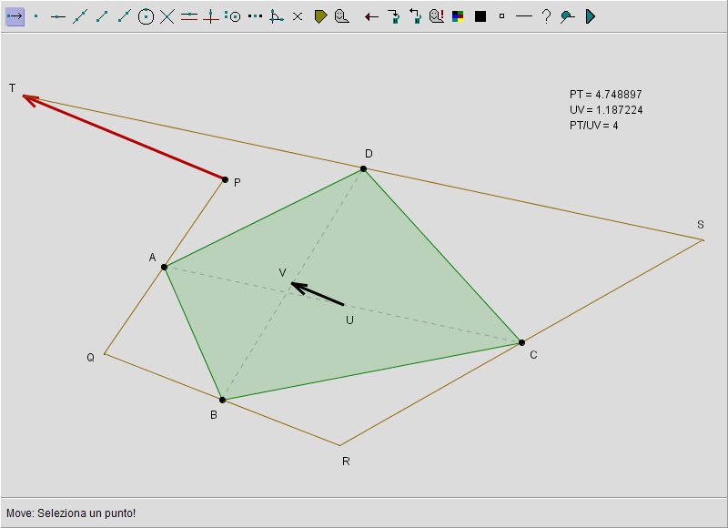 Ora basta trascinare un vertice qualsiasi di ABCD per scoprire che tale segmento appare sempre parallelo al vettore PT: si trascini a tal fine il punto P in modo da sovrapporre PT al segmento UV. Se poi tramite il tasto di Espressione algebrica
